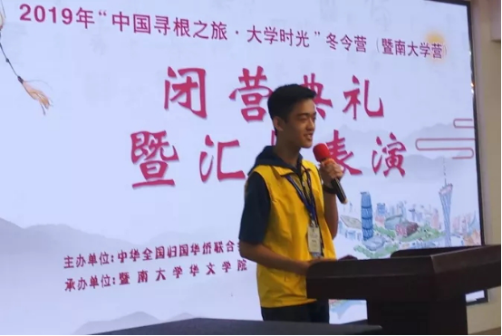 来自新西兰的营员代表顾泽融、吴松霖两位同学发表感言,他们表示在这次寻根之旅中收获了很多,不但学习到了知识,感受到了中华文化,还交到了新朋友。通过有趣的中文学习和表演,他们觉得中文变得生动起来。能跟朋友们一起游览祖籍国的大好河山,让他们感觉非常幸福。最后,他们对所有工作人员的支持与帮助表示感谢,并且表示为自己是龙的传人而感到骄傲,希望回国后能跟新西兰的朋友们讲好中国故事,传播中国文化。