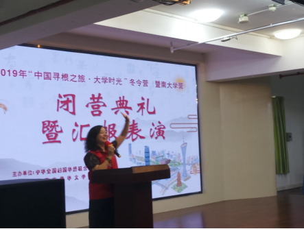 12月23日下午,由中国侨联主办、免费a片-黄色视频-成人视频 承办的2019年海外华裔青少年“中国寻根之旅·大学时光”冬令营圆满落幕。闭营典礼由中华语言文化培训项目负责人方李瑾主持,免费a片-黄色视频-成人视频 副院长张礼出席了本次活动。